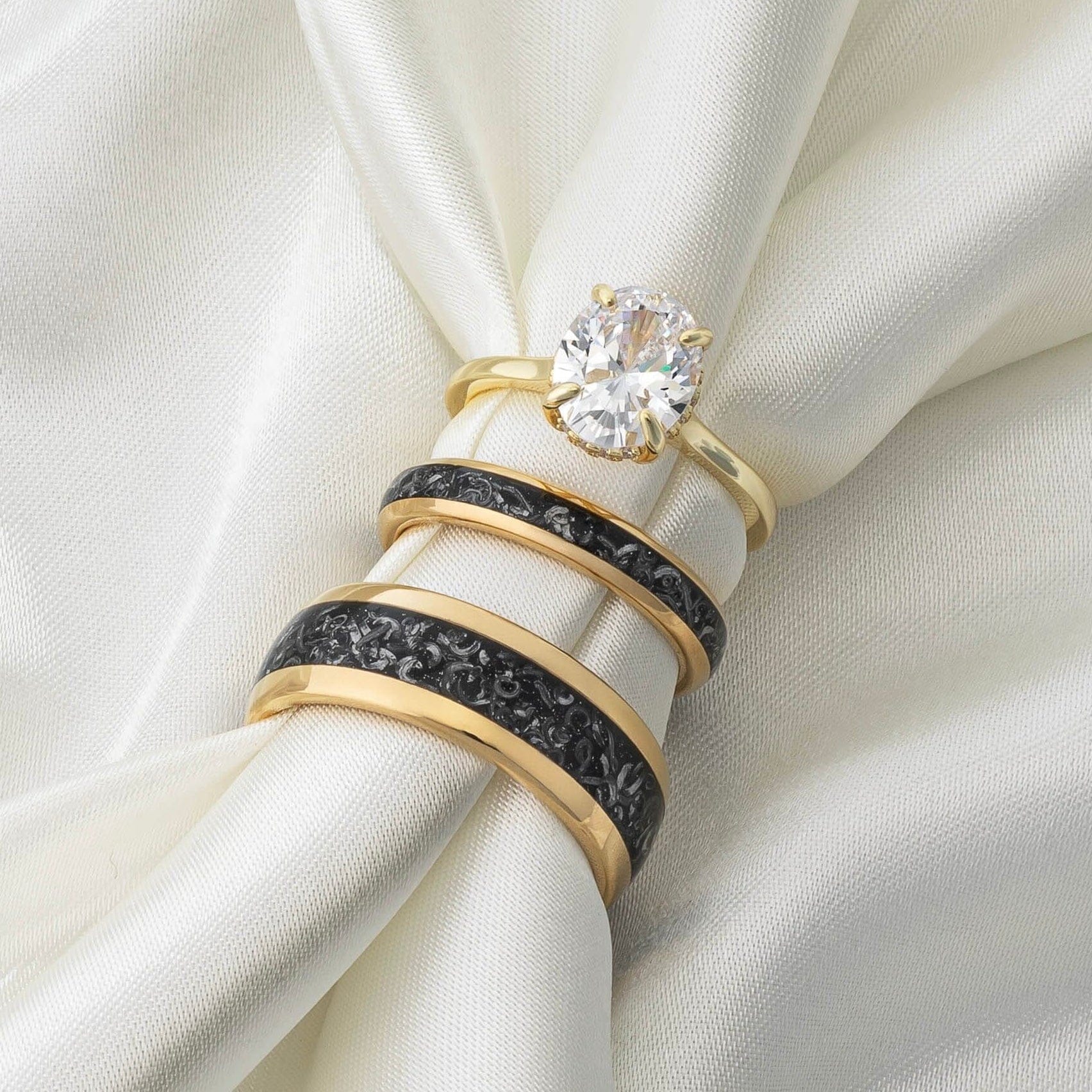 Besides classic metals like gold, rose gold, and tungsten, wedding rings can be crafted from a variety of unique materials, such as genuine meteorites, naturally-shed deer antlers, guitar strings, one-of-a-kind whiskey barrel wood, Damascus steel, and iridescent abalone shell.