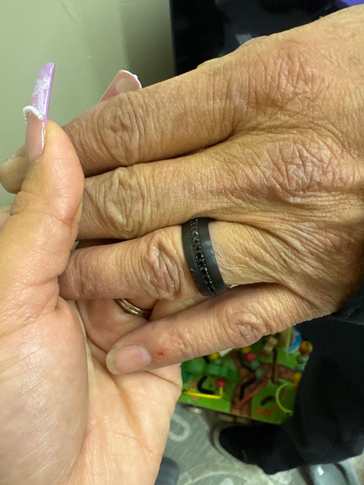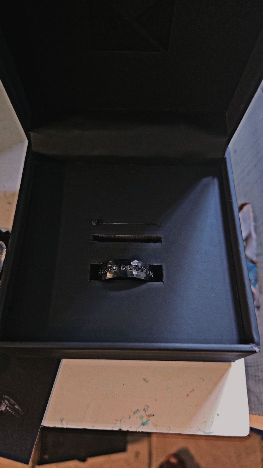 He loves his ring! At first he saw the silicon ring, then he saw the wiping cloth and asked why did he have that for a silicone ring. Then he was pleasantly surprised when he saw the ring! I am happy with my purchase. It was nice without being too flashy, just what he wanted. He liked the engraving also.