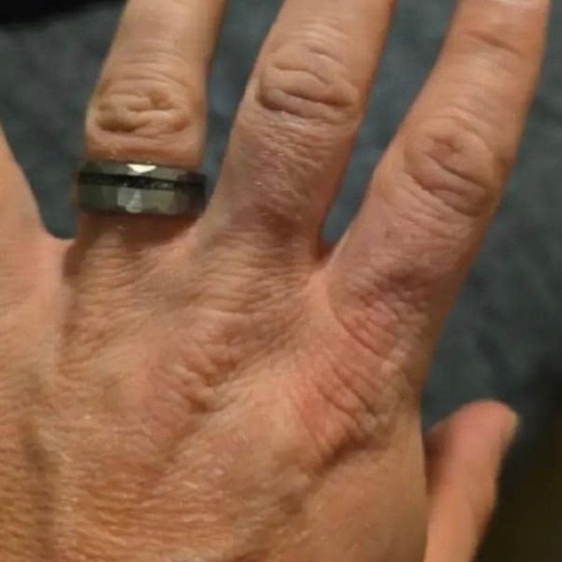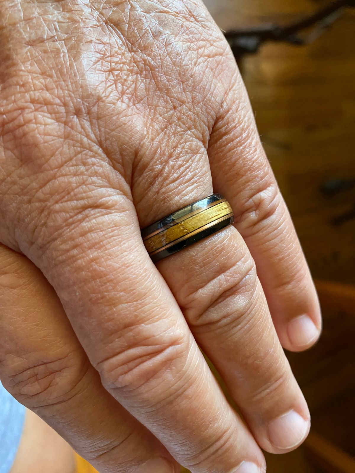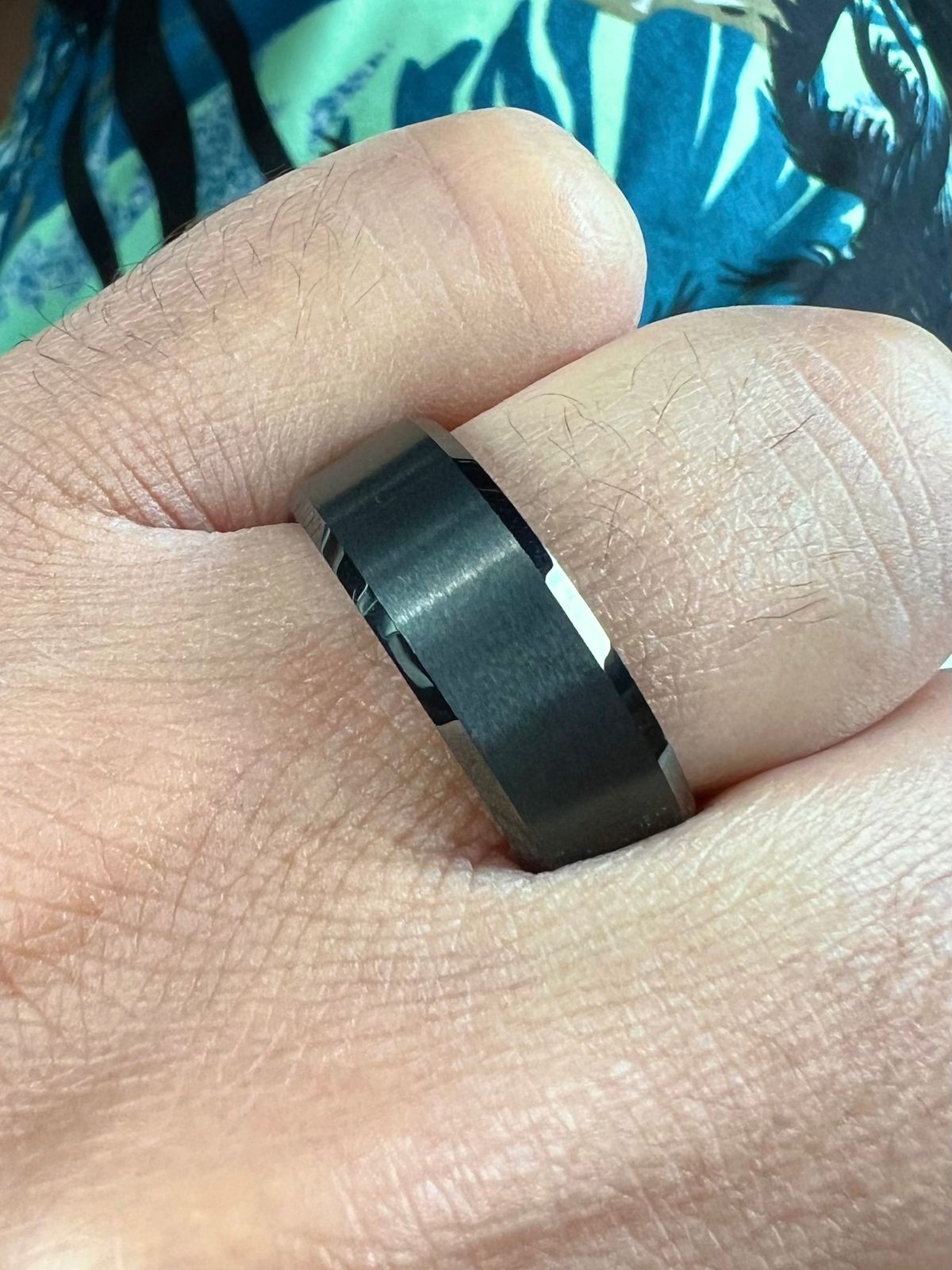 Bought this ring for my husband to replace his wedding band, and we both love it! The online pictures are nice, but don’t do it justice. It is a stunning ring. He has already received several compliments. He is proud to wear this unique and beautiful wedding band!