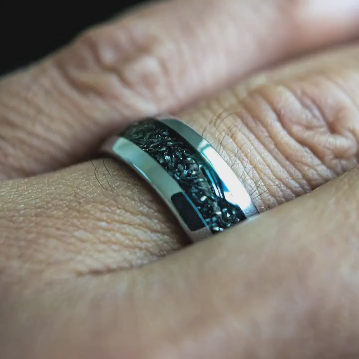 Crafted with genuine meteorite fragments that fell from space in prehistoric times, this white gold plated tungsten wedding band for him is a rare galactic treasure. Against all odds, you found your Juliet in an infinite universe. Now, start the next chapter of your story together in style.