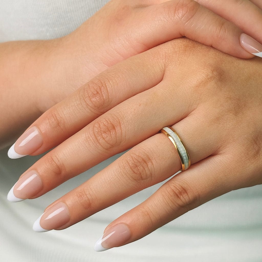 Shimmering with endless hues of wonder, the luminous opal dances with color, while the dainty golden band radiates timeless elegance fit for a fairytale.