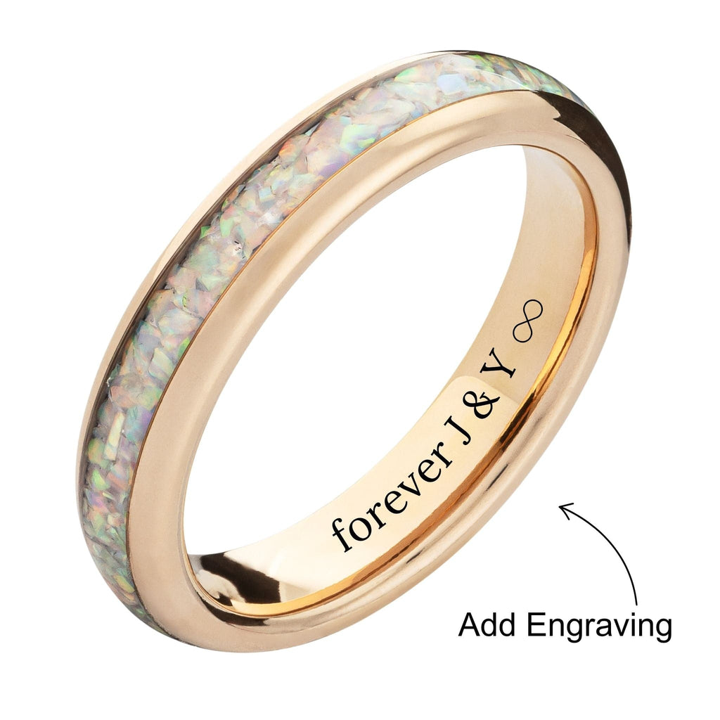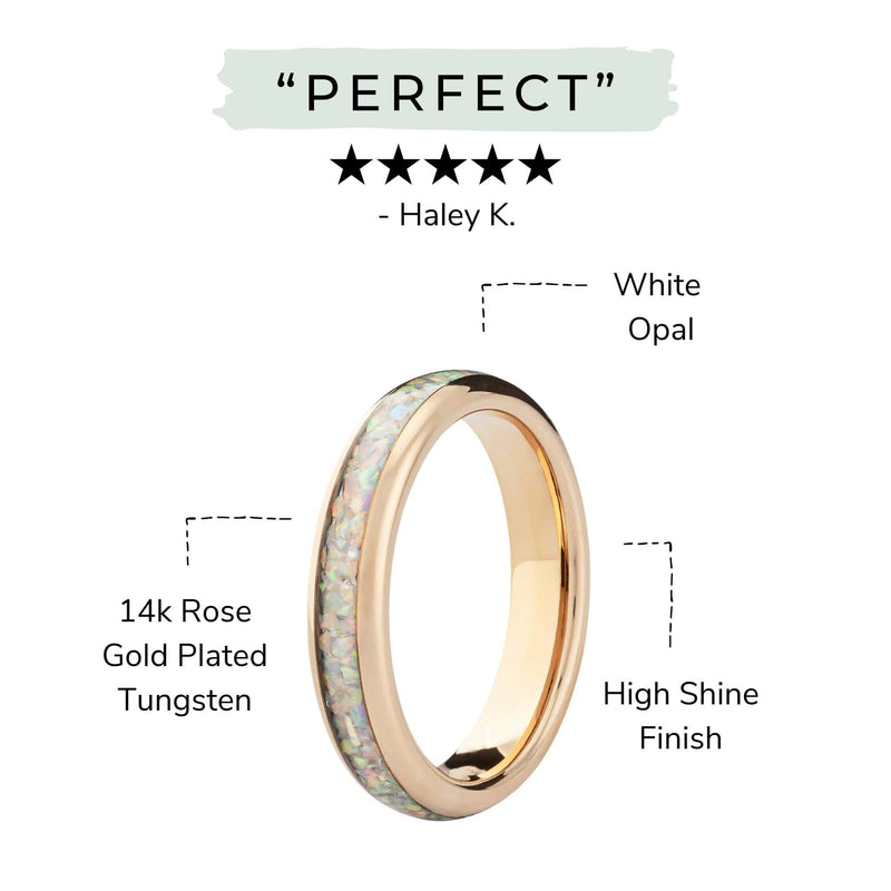 This ring is crafted from tungsten, Earth’s strongest metal. Genuine white opal and 14k rose gold-plated tungsten combine to create a wedding band that looks like it was summoned from a fairytale.