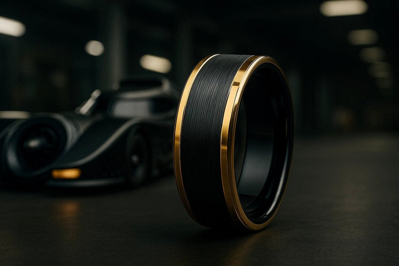 Strong. Fearless. Unshakable. Like the legend of Gotham, you fight those you love, even when no one is watching. Let this black and gold men's wedding band be your reminder of greatness.