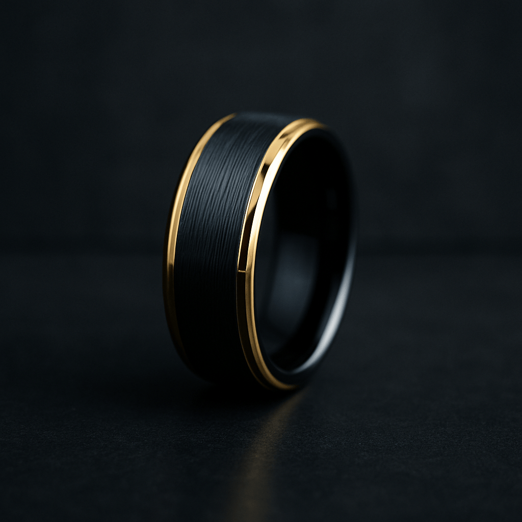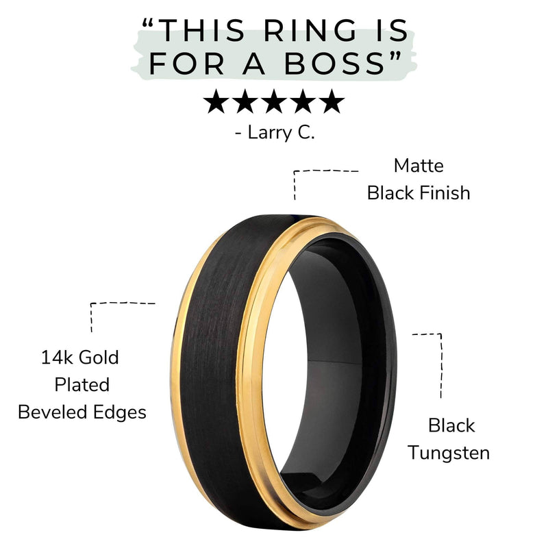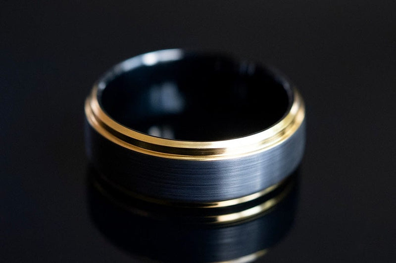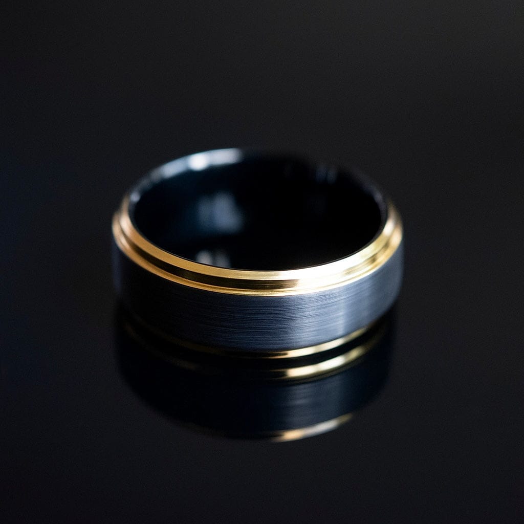 Forged in the shadows from NASA-grade tungsten, this durable black wedding band with 14k gold armor plating is built to last every mission, milestone, and moment.