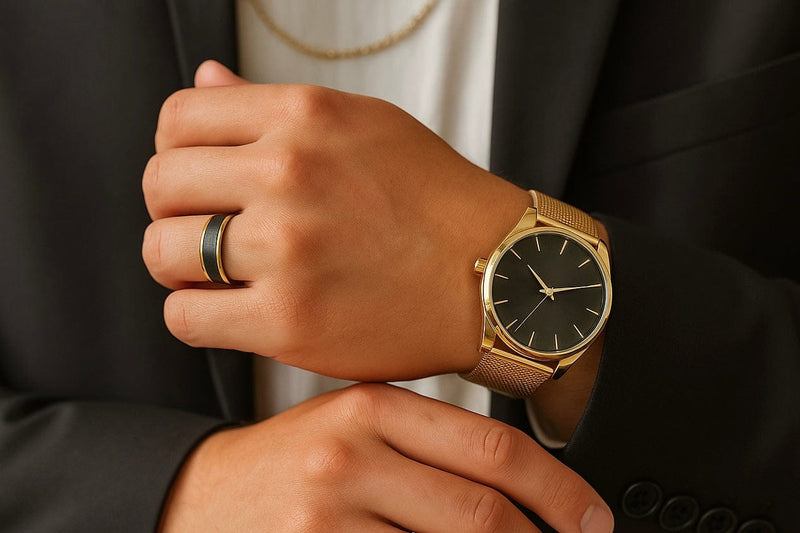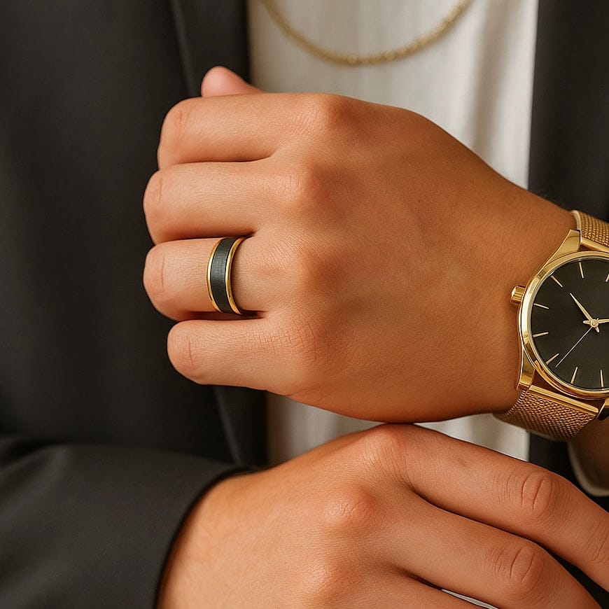 We keep most modern rings in stock at all times, so your black and gold-plated men's wedding band should ship the same day if you order by 3 PM EST Monday-Friday. We’ll need an extra day or two for personalized laser engraved rings.