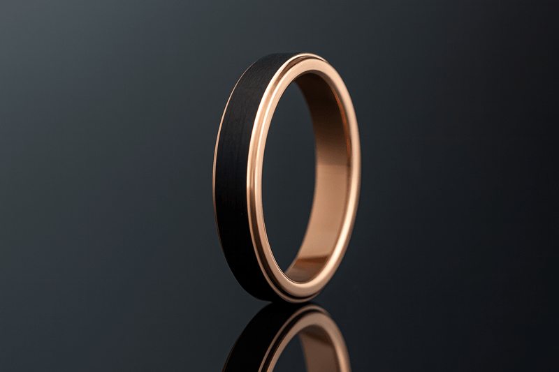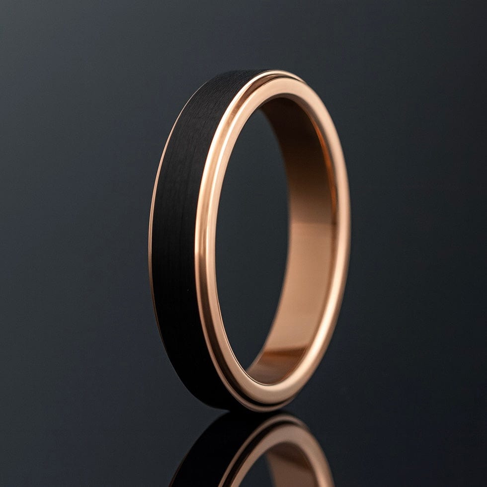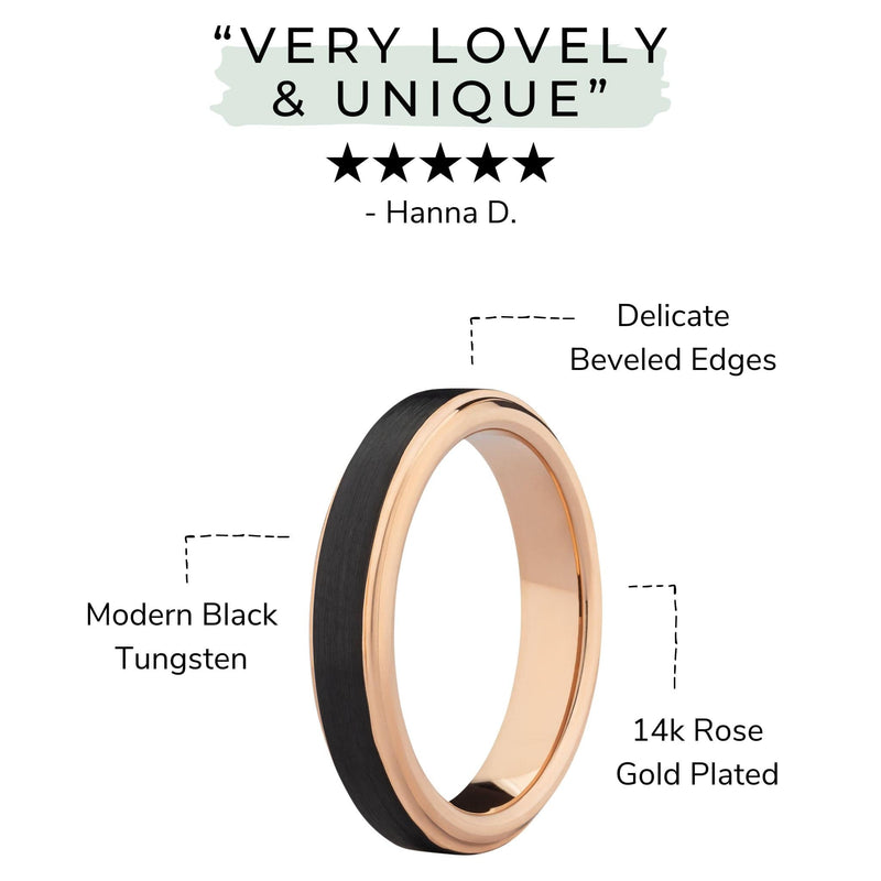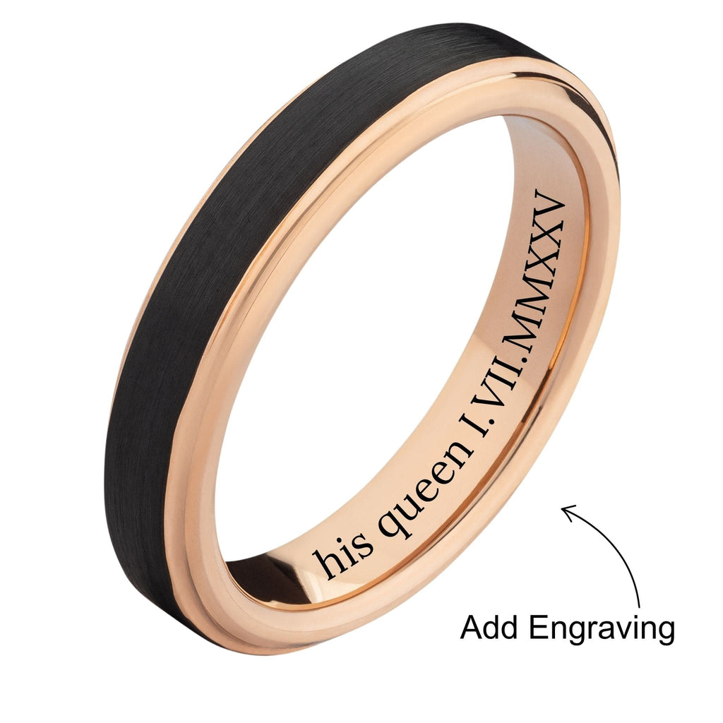 Crafted with luxurious 14k rose gold plated brushed black tungsten, a Queen's ring that will have you feeling royally in love. This rose gold ring for her is your new crown.