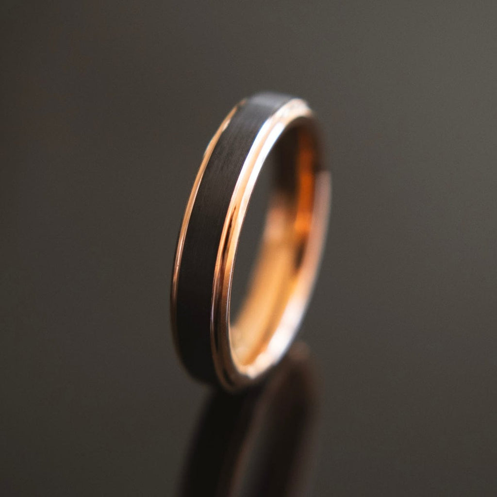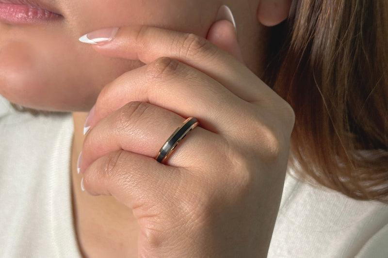 We keep our modern rings in stock, so your women's black and rose gold wedding band can arrive as quickly as possible. The queen’s treasure shall be sent the very same day if the order is received by 3 PM EST Mon-Fri. Please allow an extra 1-2 days for engraved personalization.