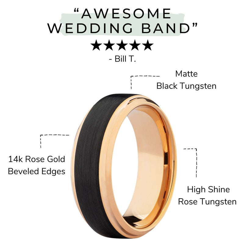 Whether you’re embarking on grand adventures or enjoying the spoils, count on this black tungsten ring with rose gold to rise to every moment with you, forged from Earth’s strongest metal.