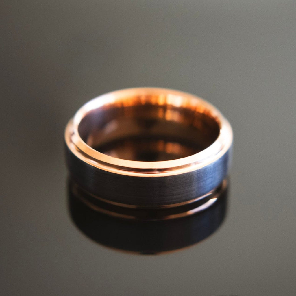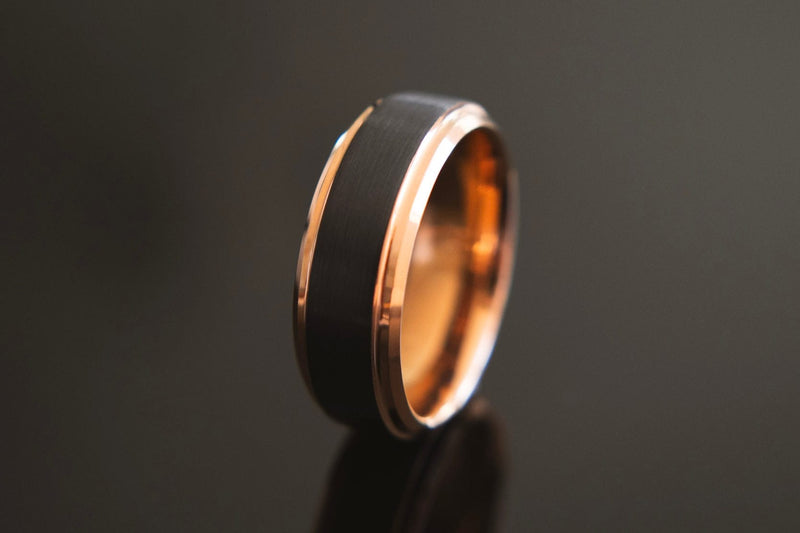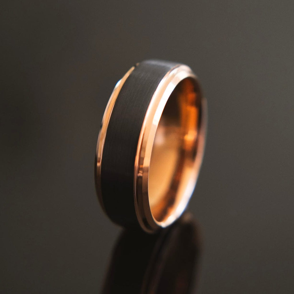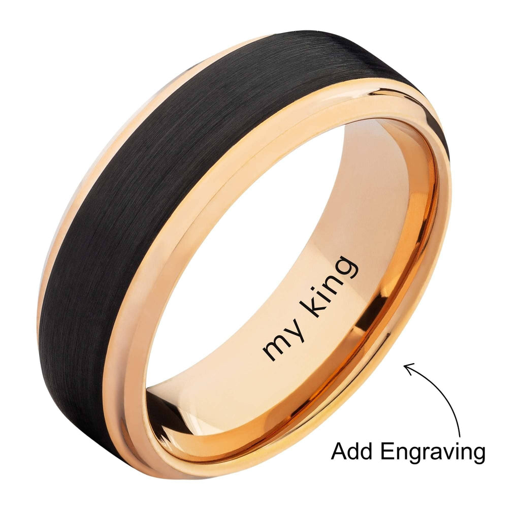 For the man who carries himself like a king and cherishes his queen. This rose gold and black wedding band is your crown. A timeless symbol of an everlasting and unbreakable bond.