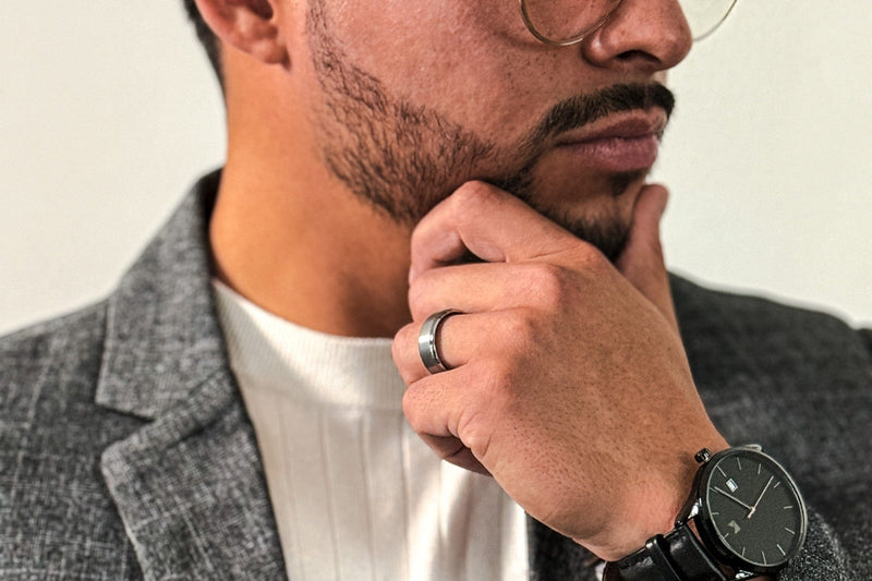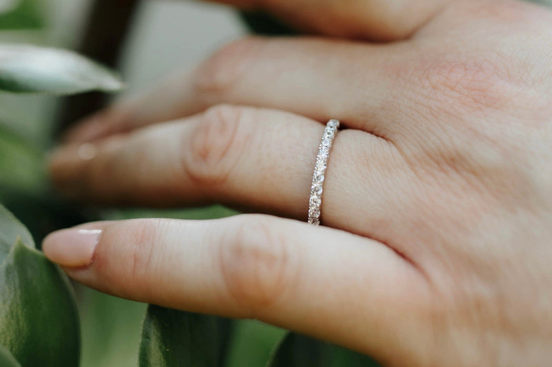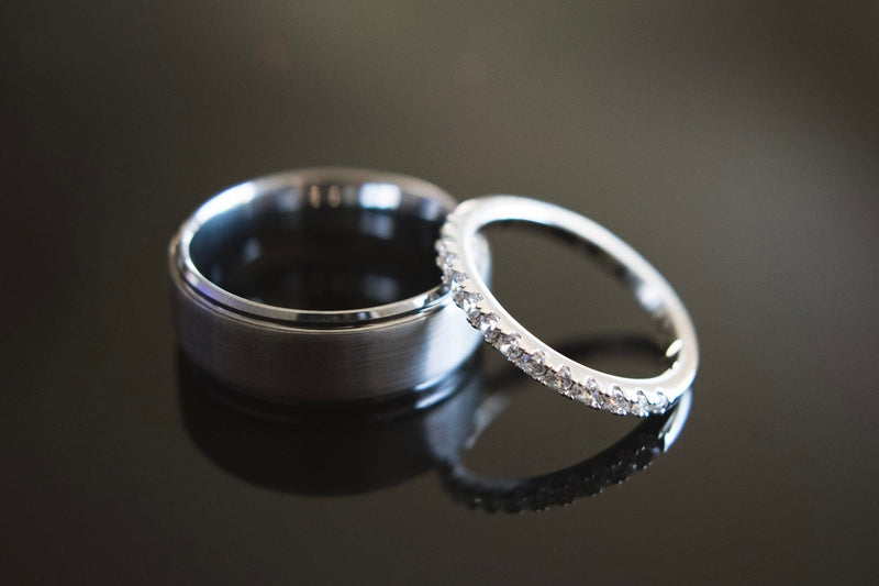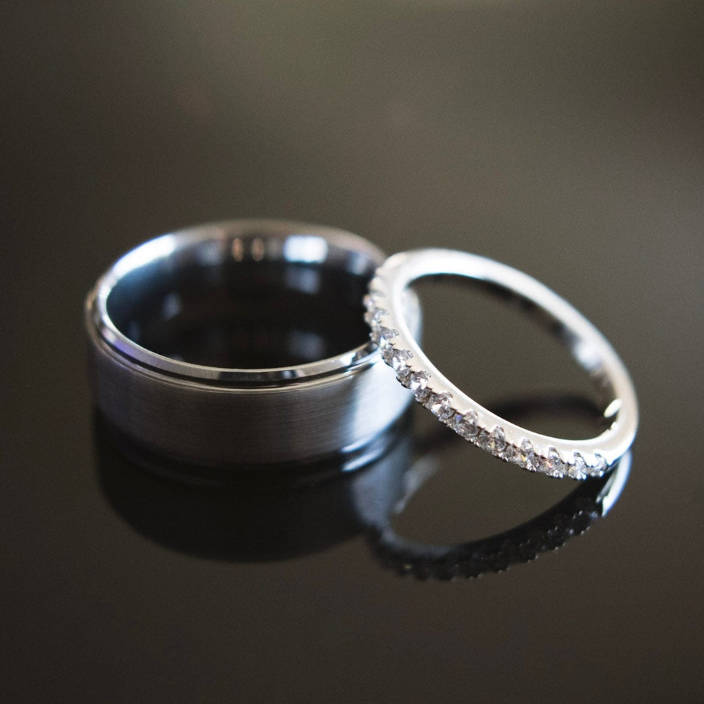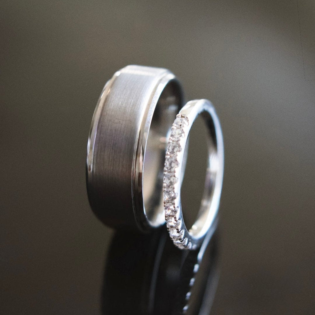The Emma Silver is a thin pave wedding band made from the highest quality, genuine .925 sterling silver. The Sinatra is one of our most durable men’s brushed tungsten rings. Because they’re both built from top-quality materials, your wedding rings should last for a lifetime with proper care.