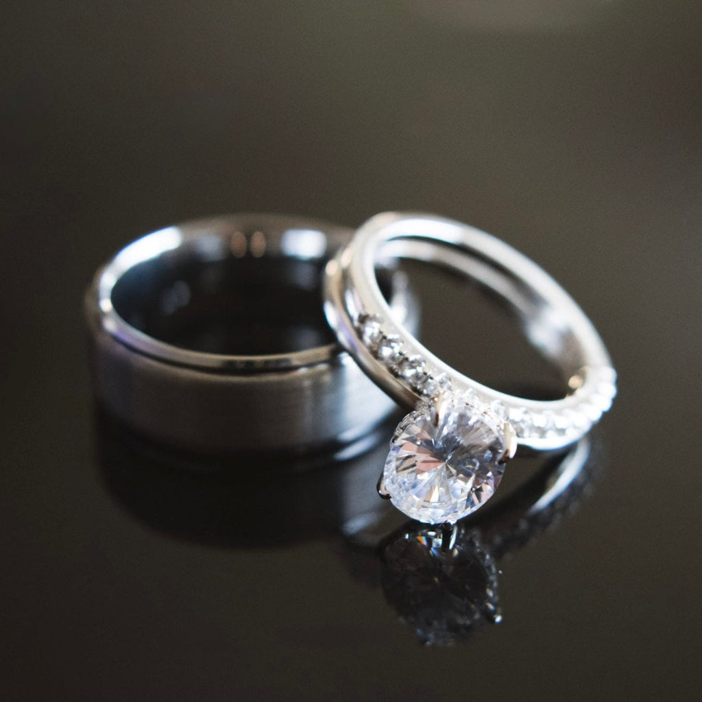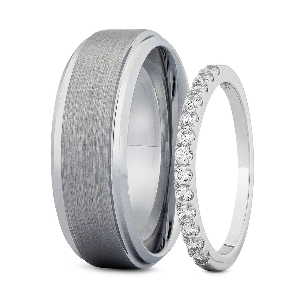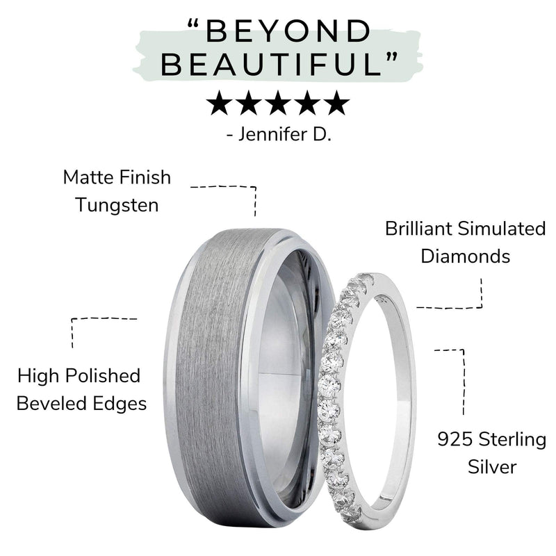 Two rings. One story. Her thin pave wedding band is crafted from .925 sterling silver and a brilliant oval cubic zirconia simulated diamond. The men's brushed tungsten ring, forged from Earth’s strongest metal, mirrors the power of a love built to last a lifetime.